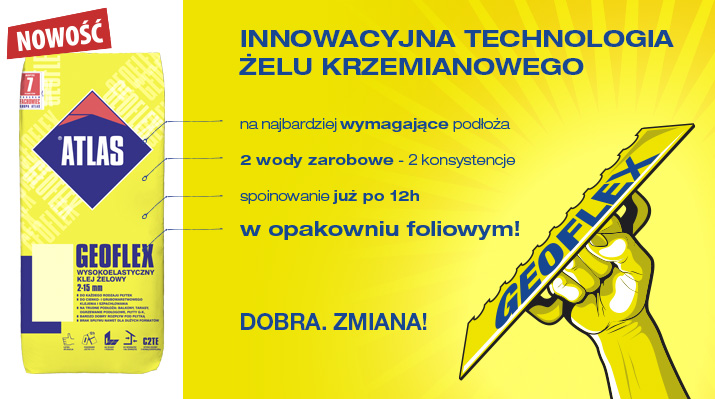 W recepturze kleju ATLAS GEOFLEX zastosowano innowacyjną technologię żelu krzemianowego. GEOFLEX to dostosowanie konsystencji kleju do indywidualnych preferencji wykonawcy i potrzeb wynikających z konkretnego zastosowania, poprzez dozowanie wody w zakresie znacznie szerszym niż w przypadku klejów tradycyjnych. Służy do przyklejenia każdego typu okładzin, zarówno nasiąkliwych jak i nienasiąkliwych. Pozwala bezpiecznie przykleić okładziny na balkonach i tarasach narażonych na bezpośrednie nasłonecznienie, ogrzewaniu podłogowym, lastryko, OSB i innych trudnych podłożach.
