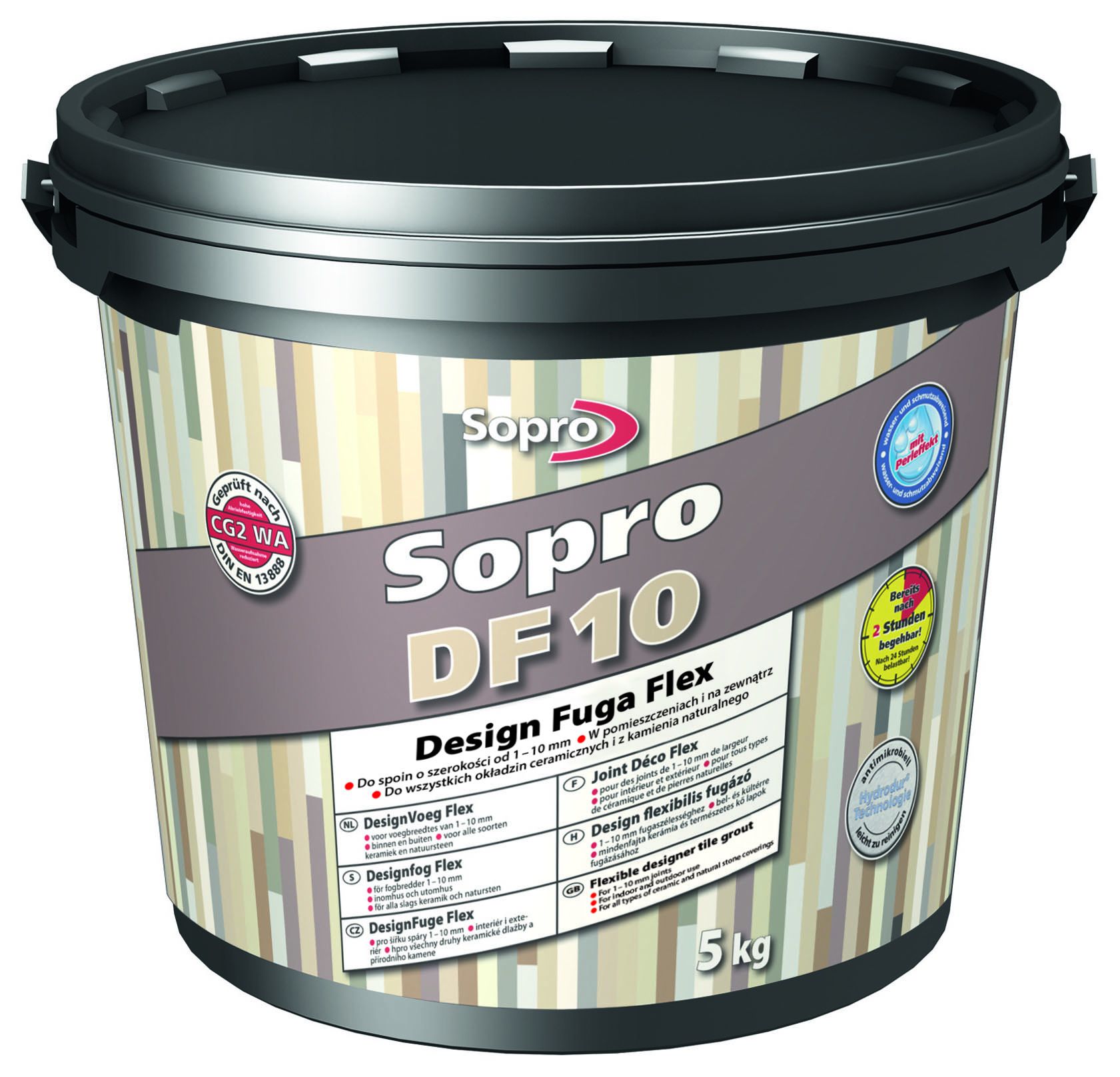 SOPRO fuga do płytek ceramicznych i kamienia naturalnego - DF 10 - 5 kg, 1-10 mm - cementowa, elastyczna, szybkowiążąca zaprawa fugowa o trwałych barwach i wysokiej wytrzymałości, o klasyfikacji CG2 WA wg PN-EN 13888, nie tworząca osadów wapiennych na powierzchni. Do spoinowania wszystkich okładzin ceramicznych i z kamienia naturalnego. Zwiększona ochrona przed rozwojem pleśni i mikroorganizmów oraz brak osadów wapiennych zapewnia trwale utrzymujący się estetyczny wygląd fugi w pomieszczeniach i na zewnątrz, a szczególnie w obszarach narażonych na oddziaływanie wilgoci. Dzięki efektowi perlenia oraz zastosowaniu technologii Hydrodur® fugę cechuje zwiększona odporność na przenikanie wody i zabrudzenia. Również nadaje się do stosowania na tarasach i balkonach, na podłogach ogrzewanych, w basenach kąpielowych oraz do fugowania cienkich płytek i płyt (≤ 4 mm).